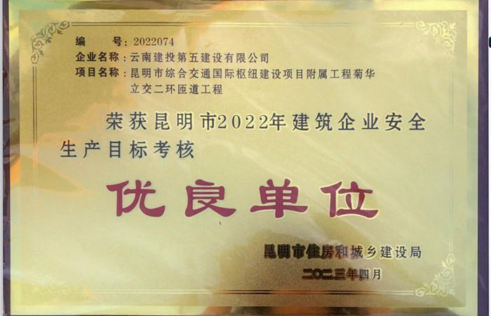 近日,由路橋一部承建的昆明市綜合交通國(guó)際樞紐建設(shè)項(xiàng)目附屬工程菊華立交二環(huán)匝道工程,榮獲昆明市2022年建筑企業(yè)安全生產(chǎn)目標(biāo)考核優(yōu)良單位,項(xiàng)目經(jīng)理常勇、項(xiàng)目安全負(fù)責(zé)人繆坤宏榮獲昆明市2022年建筑企業(yè)安全生產(chǎn)優(yōu)秀個(gè)人稱號(hào)。