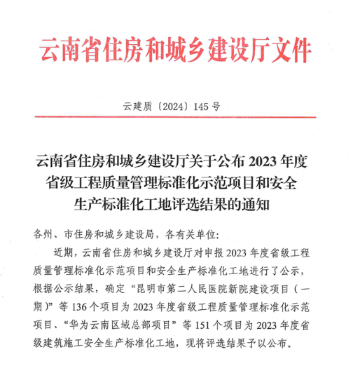 近日,云南省住房和城鄉(xiāng)建設廳揭曉了“2023年度省級工程質(zhì)量管理標準化示范項目和安全生產(chǎn)標準化工地”的評選結果,由公司第七直管項目部負責施工的云南藝術學院二期工程藝術實踐中心(含1#、2#、3#及5#、6#教學樓建設項目)、五〇八直管項目部負責施工的云南省婦女兒童發(fā)展中心建設項目及第二直管項目部負責施工的個舊市工人療養(yǎng)院提升改造項目榮獲2023年度省級安全質(zhì)量“雙標化”示范項目殊榮。