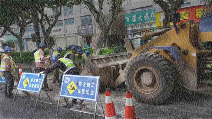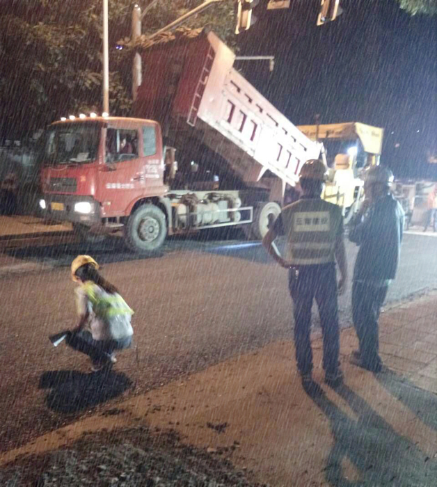 龍溪路現(xiàn)場(chǎng)施工工人冒雨工地清理銑刨剩余瀝青