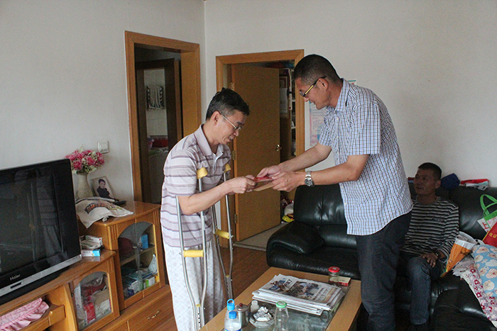 技術支持: 方森科技 2013年9月16日上午,公司第八直管項目部看望了因工傷在家休養(yǎng)的職工石亞南,了解了他的恢復情況,并為他送上節(jié)日的慰問。在中秋佳節(jié)到來之際,直八部考慮到石亞南雖然享受了工傷的優(yōu)惠政策,每月工資沒有受到影響,但他為恢復骨折而進行的治療費用金額較高,結合實際情況,直管部不僅為他送去了過節(jié)費,還送去500元的困難職工慰問金。