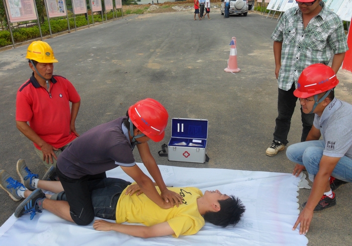 在安全管理員的指揮下,參演人員被分為3個(gè)組,每組4名成員進(jìn)行安全演練。下午兩點(diǎn)多,隨著“受傷人員”被擔(dān)架抬出,救援演練正式開始?!皞麊T”平躺于急救擔(dān)架上,每組人員分別演練了嘴鼻放氣、口對(duì)口人工呼吸和心臟擠壓等急救方法。在演練的過(guò)程中,大家邊操作邊講述急救要領(lǐng),理論和實(shí)際操作相結(jié)合起來(lái),收到了良好的效果。
