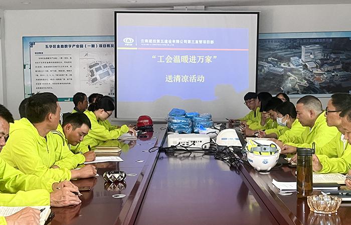 8月15-17日,第七直管項(xiàng)目部工會(huì)先后到云南藝術(shù)學(xué)院、輕紡職業(yè)學(xué)院等在建項(xiàng)目開(kāi)展“工會(huì)溫暖進(jìn)萬(wàn)家”送清涼活動(dòng),為堅(jiān)守項(xiàng)目一線的職工送去小風(fēng)扇、防曬袖套、清涼油、花露水等“清涼大禮包”?;顒?dòng)中,直管部工會(huì)主席向一線職工講解夏季防暑降溫的小常識(shí),分享預(yù)防蚊蟲(chóng)叮咬的小妙招,囑咐大家要做好防暑降溫工作,合理安排好高溫工作時(shí)間,注意自身健康,謹(jǐn)防高溫中暑。要求項(xiàng)目部要把健康安全放首位,注意食堂衛(wèi)生、菜品?!?